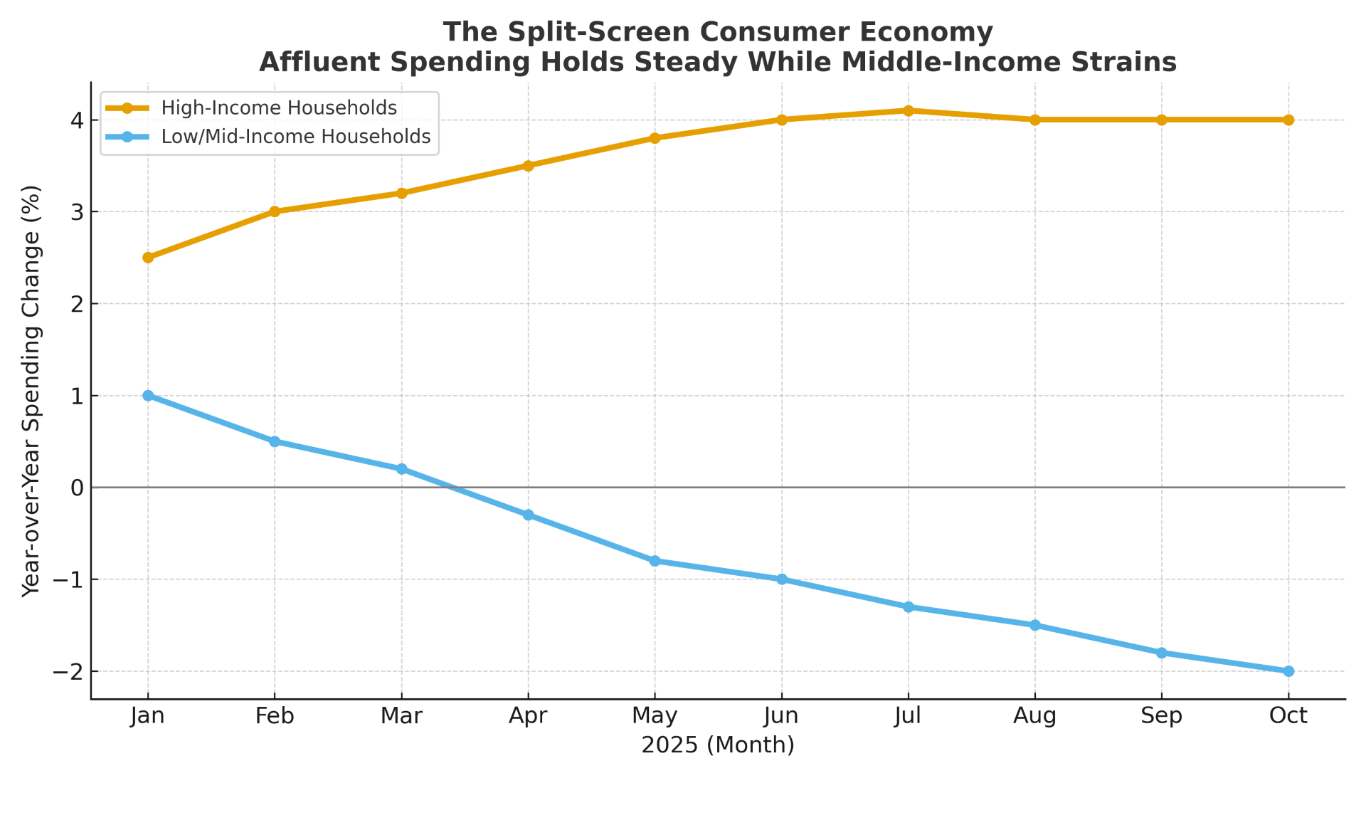 High-income spending is stable and growing; middle-income spending is contracting.